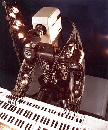 政府出展の「テーマ館」に、当社が製作した人間型の「鍵盤楽器演奏ロボット」が展示されました。見る・聞く・話すなど人間の知的能力を持っており、操作員と会話をおこない、予め記憶した曲目の演奏や、楽譜を読みとって譜面通りに演奏をし、来場者を驚かせました。現在は、つくばエキスポセンターに展示されています。