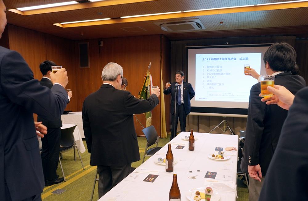 3月28日(金)に、陸上競技部の選手たち、監督やスタッフ、関係役員が一堂に会する納会を開催しました。一年を通して、それぞれ異なる場所でトレーニングを行っている長距離や短距離の選手たち、マネージャーやスタッフがほぼ全員そろう貴重な機会です。ここ数年は、選手同士でも直接会って話す機会がなかったとのことで、みんなそれぞれ親交を深めていました。