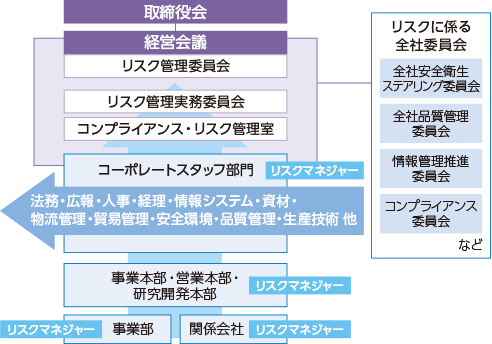 当社グループでは、リスクマネジメント活動を統括する組織として社長を委員長とするリスク管理委員会を設置し、安全、災害、品質、環境など事業活動をとりまくさまざまなリスクについて、グループ横断のリスク軽減対策を進めています。また、リスクが顕在化した場合は、リスクマネジメントの基本方針のもと、迅速かつ適切な対応をとれる仕組みを整えています。
