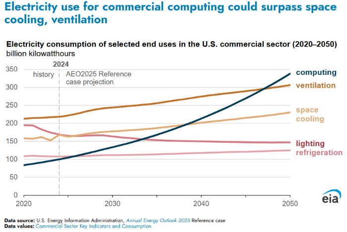 - U.S. Energy Information Administration. (2025, June 25). Electricity use for commercial computing could surpass space cooling and ventilation. Today in Energy. Retrieved from https://www.eia.gov/todayinenergy/detail.php?id=65564