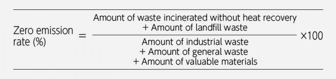 Recycling rate (%) = (heat recovery + material recycling + valuable materials) / Total amount of waste (Waste landfilled or incinerated without heat recovery + heat recovery + material recycling + valuable materials) × 100