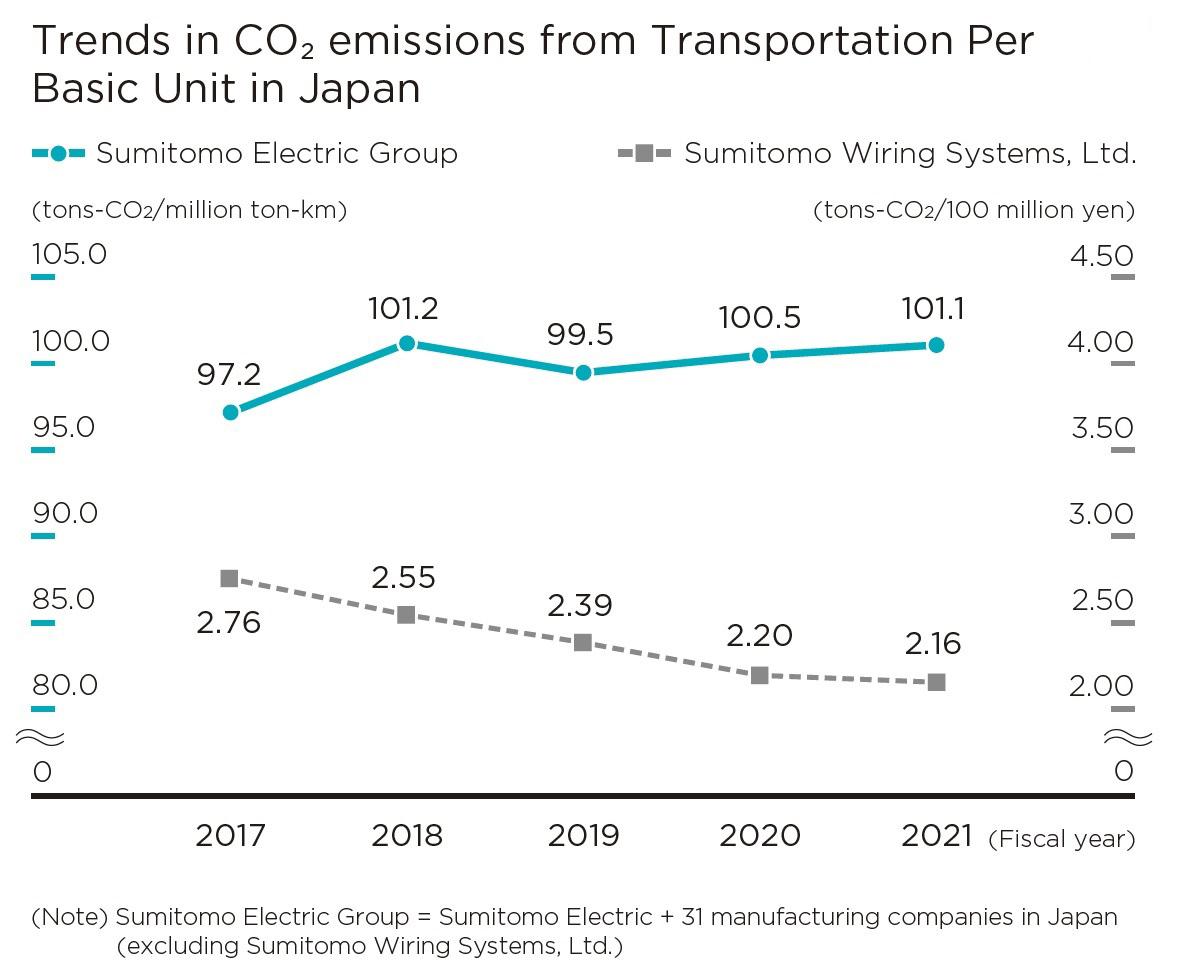 In addition to the known shippers with large freight volumes, which are subject to regulations, we strive to realize more environment-friendly logistics in our manufacturing affiliates in Japan by reducing per-unit CO₂ emissions through the promotion of modal shift and improvement in the truck loading efficiency.